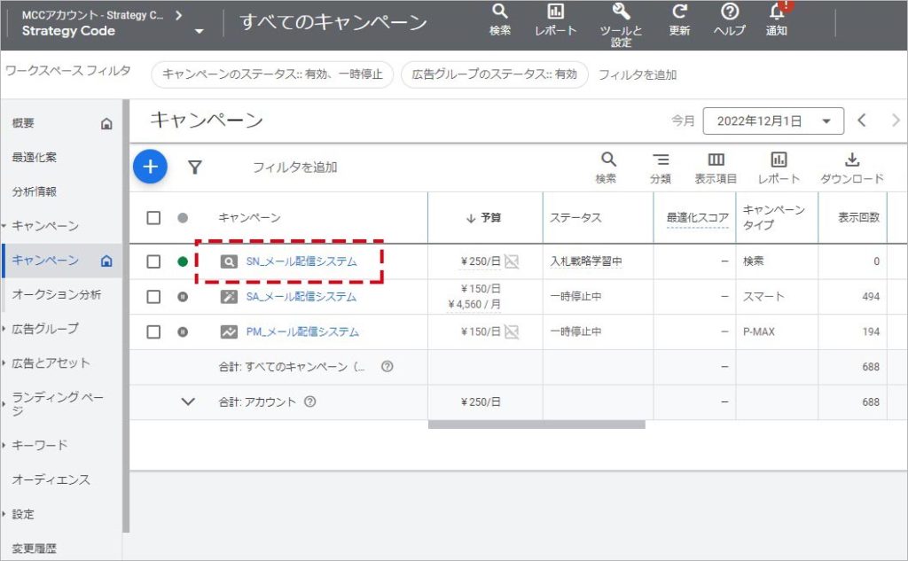 Google 広告にログインしたら、品質スコアを確認したい対象の検索キャンペーンをクリックします。