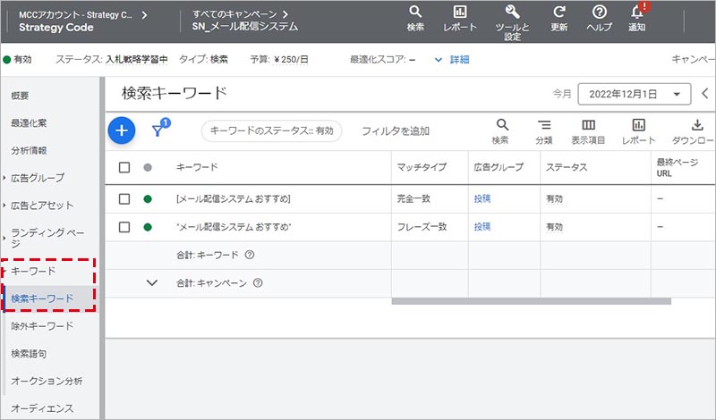 「▼ キーワード」のメニュー項目の中にある、「検索キーワード」をクリックします。