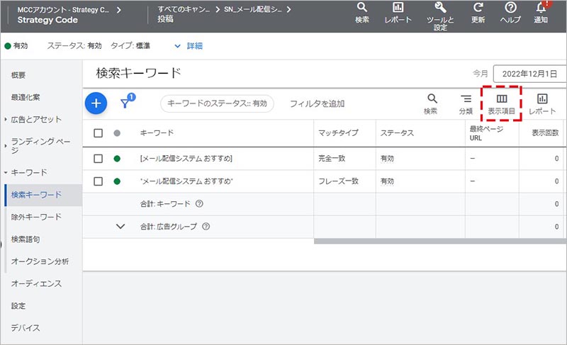 出稿しているキーワードの一覧が表示されたら、「表示項目」をクリックします。
