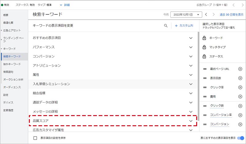表示項目のリストの中にある「品質スコア」をクリックします。