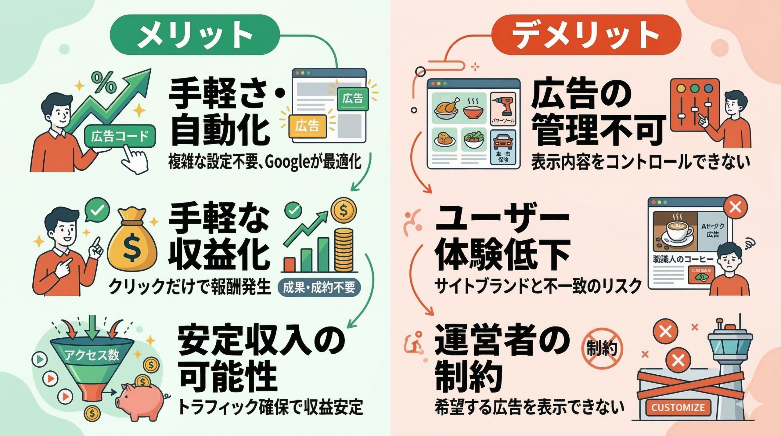また、サイトのブランドやテーマにそぐわない広告が表示される場合があり、その結果、ユーザー体験を損なうリスクがあります。