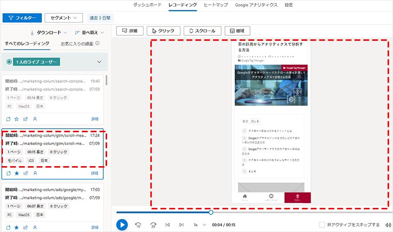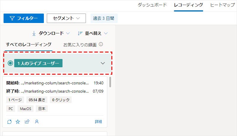 レコーディングでは主に、ウェブサイト上でのユーザーの個々の動きを確認することが出来ます。