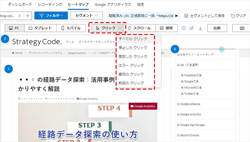選択した URL のヒートマップ画面に遷移します。デフォルトでは、「 PC 」デバイスの「全てのクリック」が選択された状態のため、まずは確認したい任意のデバイス( PC or タブレット or モバイル)を選択します。
