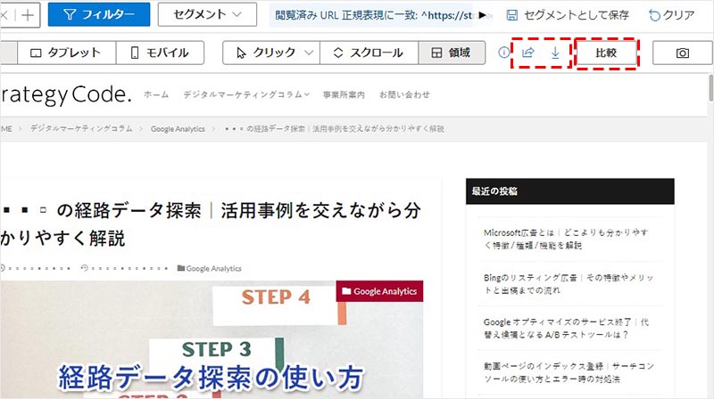 特に、「比較」の機能を使うと、異なるページとの比較や、同一ページで異なるデバイスでの比較、同一ページで異なる期間での比較などを確認することが出来ます。