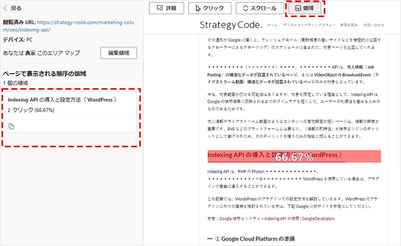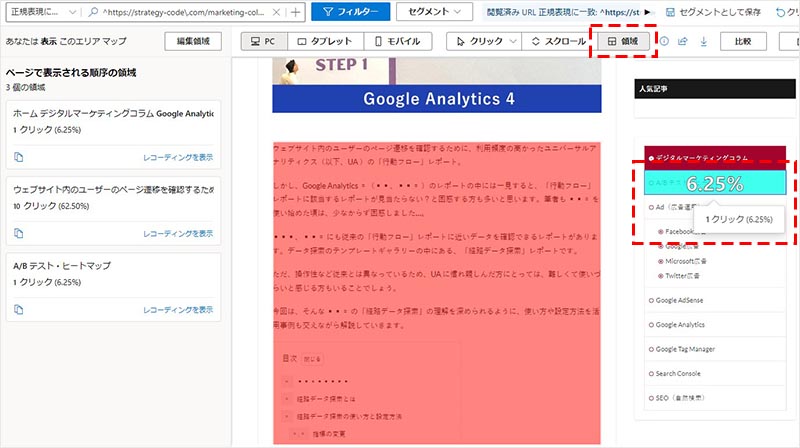 領域を選択すると、ヘッダーやフッター、ボディ、サイドカラムなどの領域ごとのクリック数(クリック率)を確認することが出来ます。