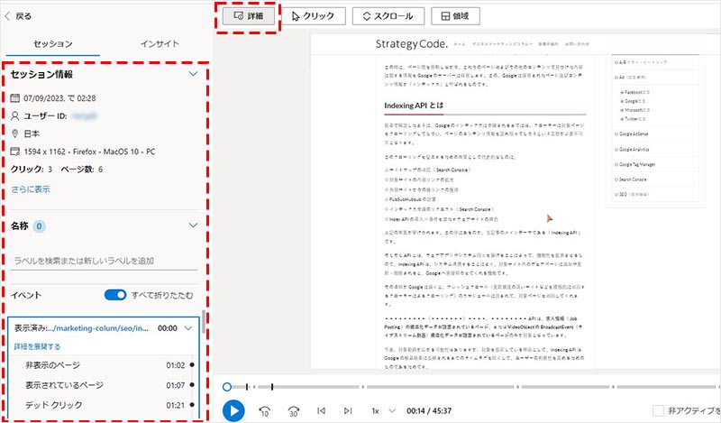対象セッションのクリックヒートマップを確認することが出来ます。