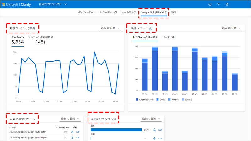 反対に、Clarity 側でも Google アナリティクスのダッシュボードを表示させることが出来ます。