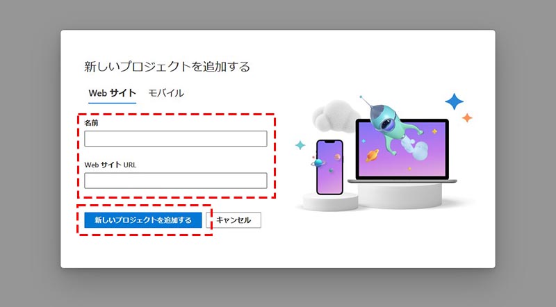 サイト名と URL を入力し、「新しいプロジェクトを追加する」をクリックします。