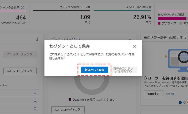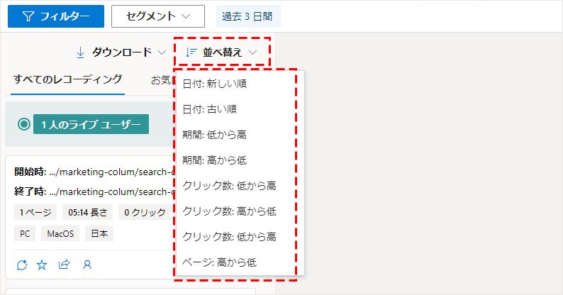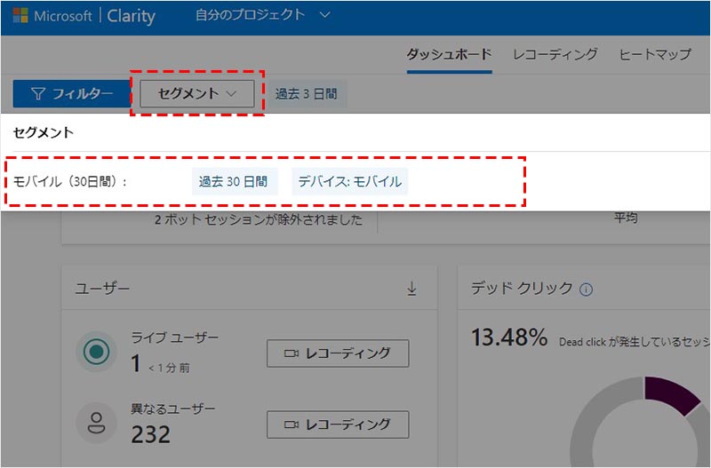 アナリティクスでセグメントを適用して、対象ユーザーの( Clarity の)レコーディングにフィルタリングするといった使い方が可能です。