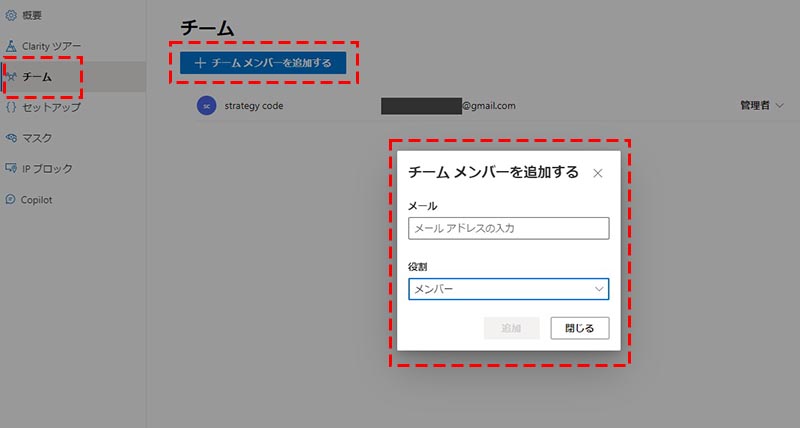 チームでは、Clarity のデータを複数メンバーで共有する場合のメンバー管理を行うことが出来ます。