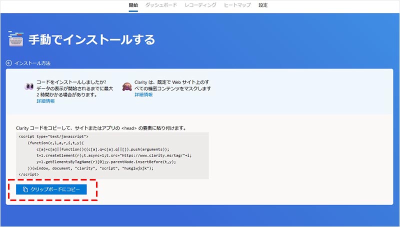 ウェブサイトの<head>タグに挿入する Clarity のコードが表示されるので、「クリップボードにコピー」をクリックして、コピーします。