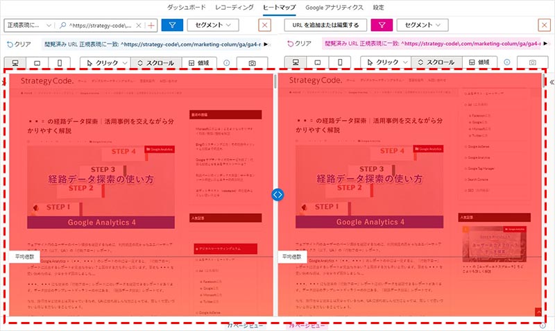 2つのヒートマップを並べて表示することも出来るため、同一ページの異なるバージョンを比較することで、簡易的な A/B テストとしての使い方も可能です。