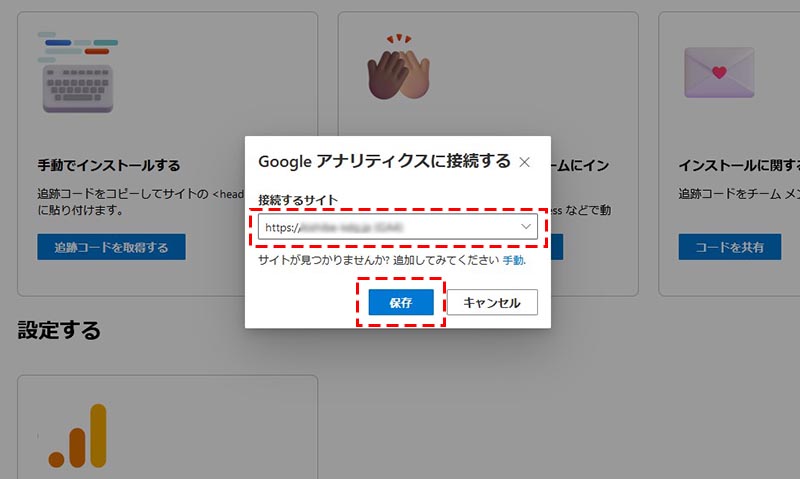 「接続するサイト」の候補に、アクセスを許可した Google アカウントに紐づく Google アナリティクス プロパティが表示されるため、対象のプロパティを選択し、「保存」をクリックします。