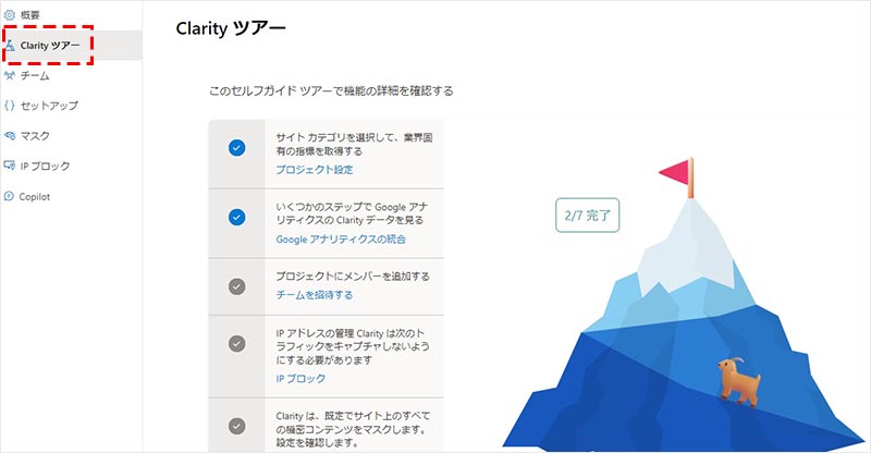 Clarity ツアーでは、Clarity が推奨する各種設定項目、設定の反映状況を確認することが出来ます。