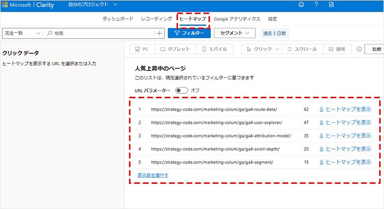上部メニューの「ヒートマップ」をクリックすると、対象期間でのセッションの多い URL が一覧で表示されます。