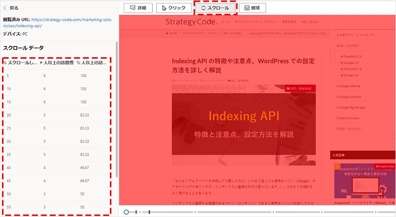 スクロールを選択すると、左側のスクロール深度の割合が表示されます。また、右側のプレビュー画面ではカーソルを置くと、そのポイントのスクロール到達率を確認することが出来ます。