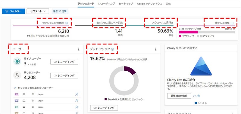 Clarity の導入が完了してデータが溜まりはじめたら、いよいよデータ分析に着手することで出来ます。ここからは、Clarity の管理画面の各機能や使い方について説明していきます。