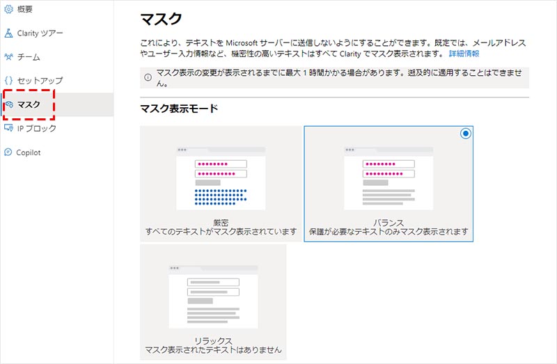 デフォルトでは、保護が必要な機密性の高いテキストのみをマスクする「バランスモード」です。
