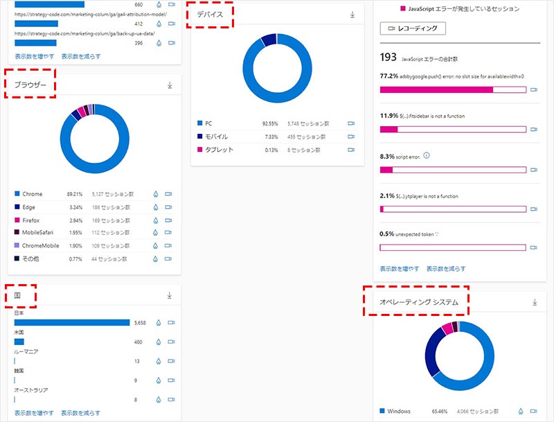 | JavaScript のエラー | JavaScript エラー(ブラウザーで JavaScript 実行中のエラー)が発生しているセッションの内訳。 「レコーディング」をクリックすると、JavaScript エラーのある録画済みリストに遷移します。 |