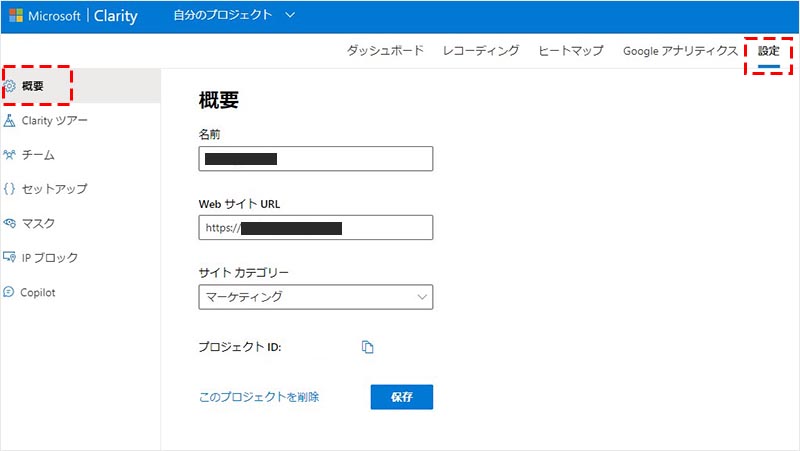 「設定」をクリックすると、Clarity の各種設定項目が表示されます。