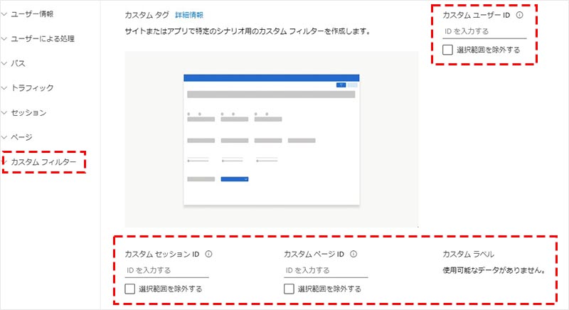 カスタムフィルターでは、「カスタムユーザーID」「カスタムセッションID」「カスタムページID」「カスタムラベル」から指定して、対象データを抽出することが出来ます。