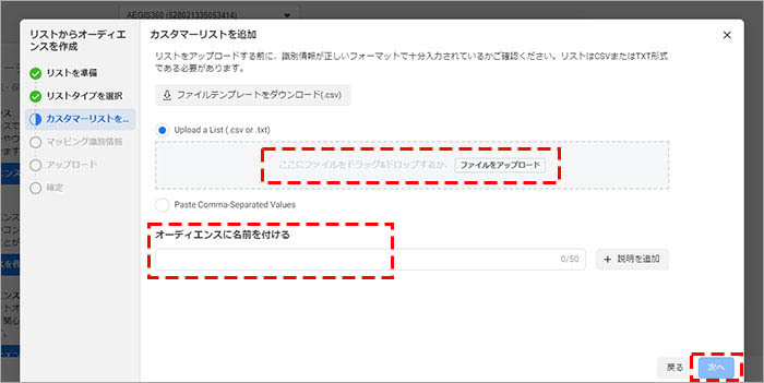 「ファイルをアップロード」をクリックして、先ほど作成した顧客データのCSVファイルをアップロードし、「オーディエンスに名前を付ける」という項目で、任意のオーディエンス名を入力します。