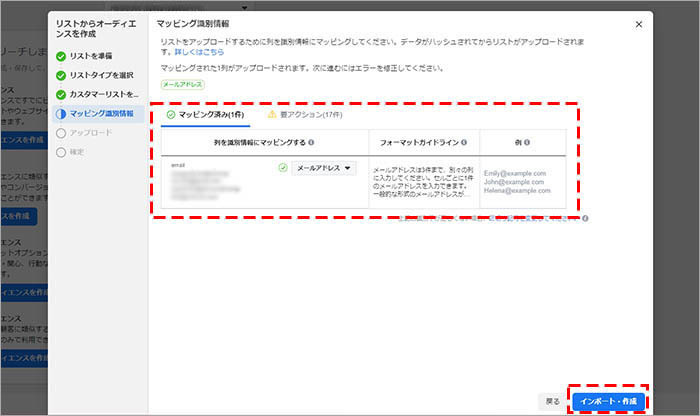 マッピング識別情報の画面で、リストの列にマッチングする識別情報を選択します。今回は、メールアドレスの情報のみをアップロードしようとしているため、「マッピング済み」にメールアドレスが表示されています。