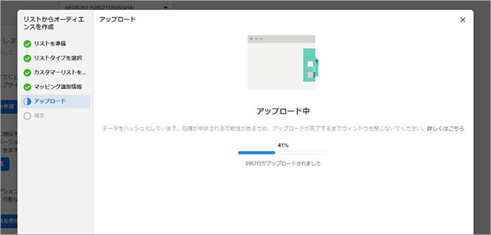 メールアドレスのデータのみをアップロードしようとしているため、「まだマップされていない識別情報17件がファイルに存在するようです。データのマッピングを完了し、マッチレートを上げてください。」と表示されますが、そのまま「アップロード」をクリックします。