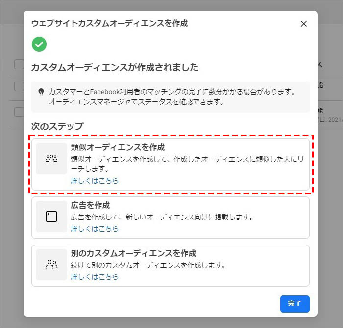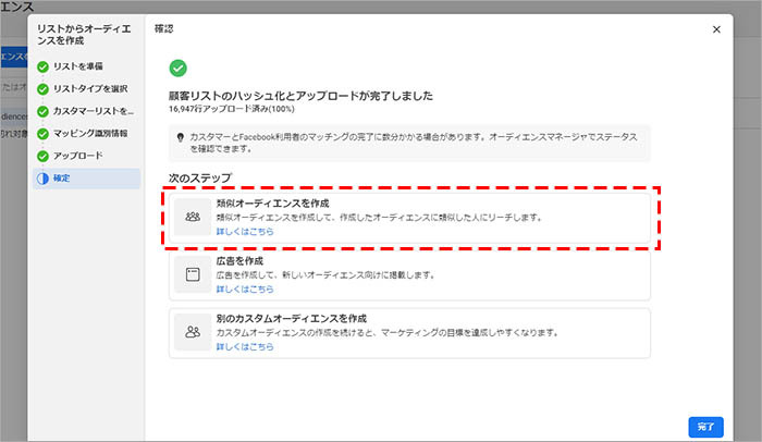 アップロードが完了後、表示される画面の「次のステップ」から、「類似オーディエンスを作成」をクリックします。