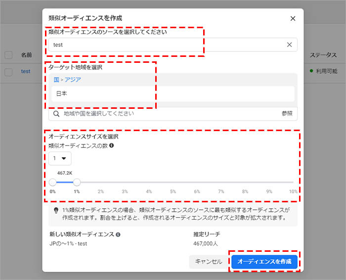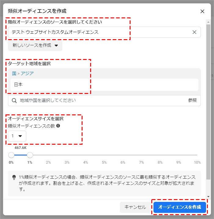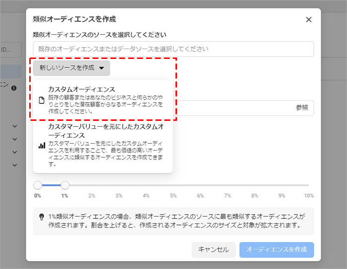 ※ 1%を設定した場合、類似オーディエンスのソースに最も類似するオーディエンスが作成されます。割合を上げると、作成されるオーディエンスのサイズと対象が拡大されます。最初は最も類似するオーディエンスである1%から配信を始めて、リーチ数を見ながら段階的に上げていくことをおすすめします