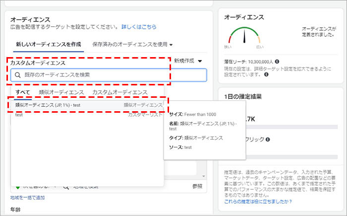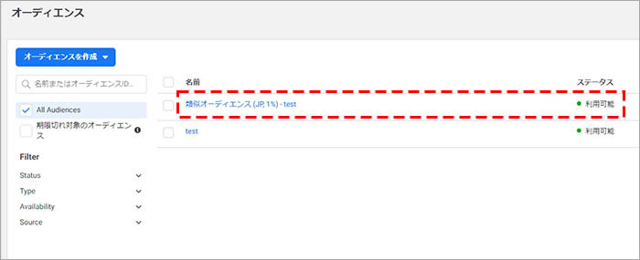 これで、類似オーディエンスの作成が完了したので、広告セットのオーディエンスの設定で、カスタムオーディエンスから先ほど作成した類似オーディエンスを選択して、配信を開始します。