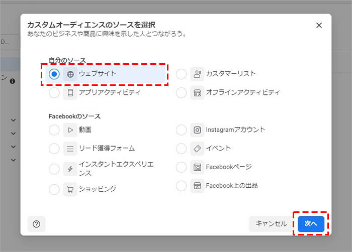 「新しいソースを作成」のタグをクリックして表示される、「カスタムオーディエンス」をクリックします。