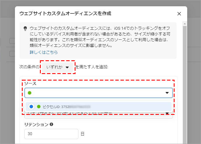 「ウェブサイトカスタムオーディエンスを作成」の画面で、次の条件の「いずれか」または「すべて」 を選択し、「ソース」にウェブサイトに仕込んだピクセルを選択します。