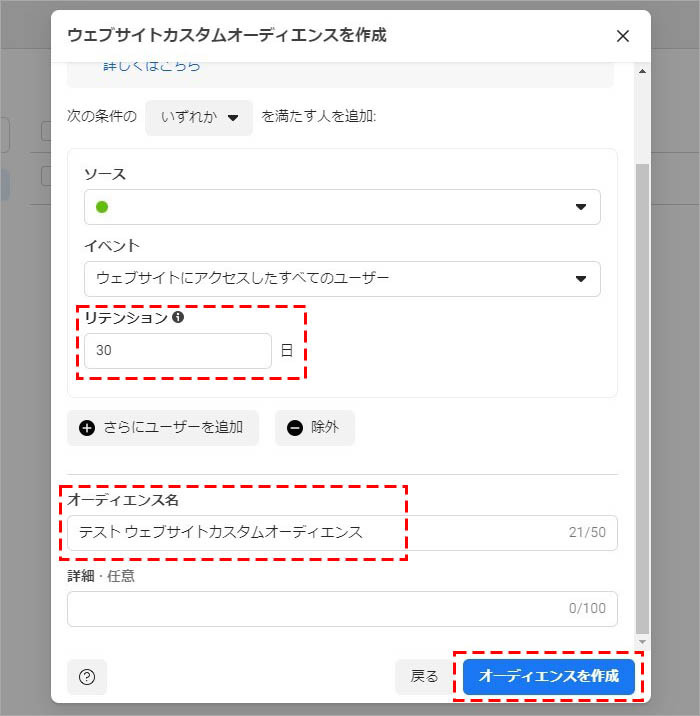 次に、「リテンション」の項目で、条件を満たした人がオーディエンスに残る日数(最長で180日間)と、任意のオーディエンス名を入力して、「オーディエンスを作成」をクリックします。