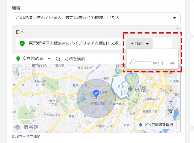 地域ターゲティングは、特定の国、都道府県・州、市区町村、郵便番号、住所で場所を指定し、指定した場所から半径でターゲティングする範囲を設定することもできます。