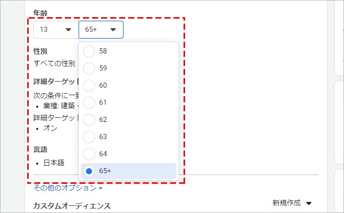 年齢に関しては、18歳~64歳まで、1歳単位で指定することが可能です。65歳より上は、「65歳以上 (65+) 」という選択肢のみとなります。