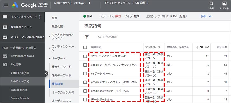 例えば、出稿ワードを [データポータル アナリティクス] の完全一致として設定していた場合、完全に一致する「データポータル アナリティクス」という検索語句でもちろん広告が表示されますが、それ以外にも、