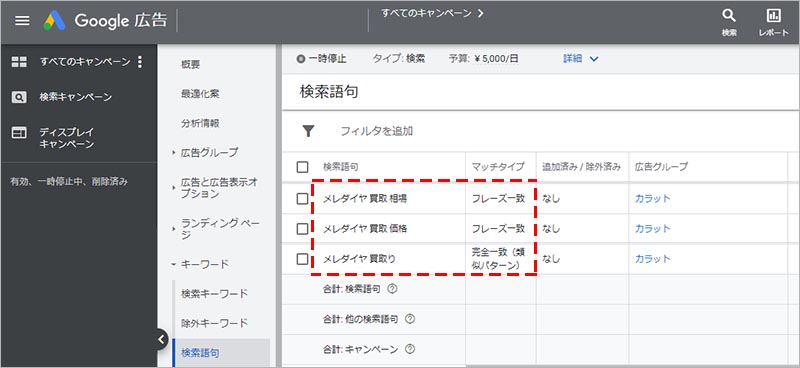 例えば、出稿ワードを “メレダイヤ 買取” のフレーズ一致として設定していた場合、「メレダイヤ 買取」という検索語句でもちろん広告が表示されますが、それ以外にも、