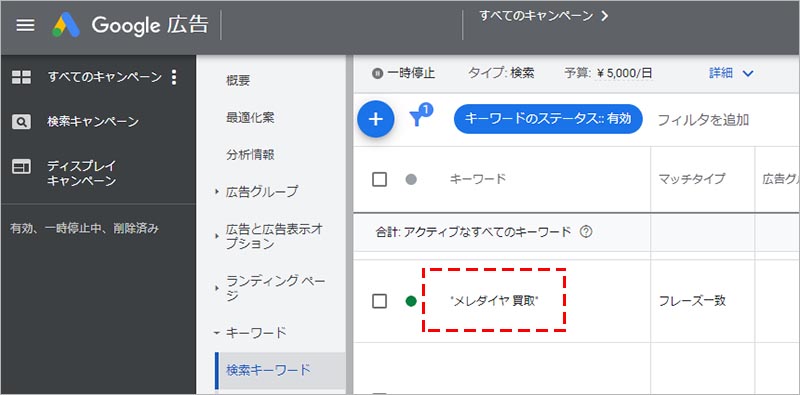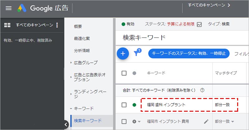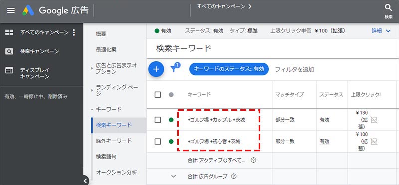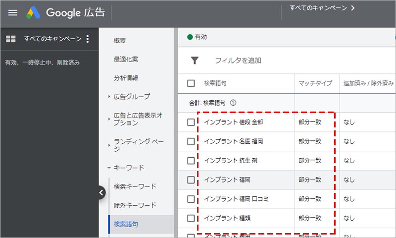 部分一致は、Google広告の管理画面の検索キーワードで、キーワードの前後に何も文字列を付けずにそのまま登録します。