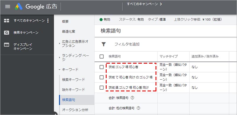 完全一致は、Google広告の管理画面の検索キーワードで、キーワードの前後を [ ] で括って登録します。