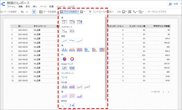グラフを追加したい場合は、「グラフを追加」を選択して、表示されるグラフの種類から任意のものをクリックします。