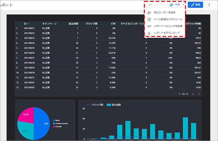 また、レポートを共有したい場合は、「共有」のプルダウンをクリックすると、「他のユーザーを紹介」「メール配信をスケジュール」「レポートへのリンクを取得」「レポートをダウンロード」の中から選択することが出来ます。