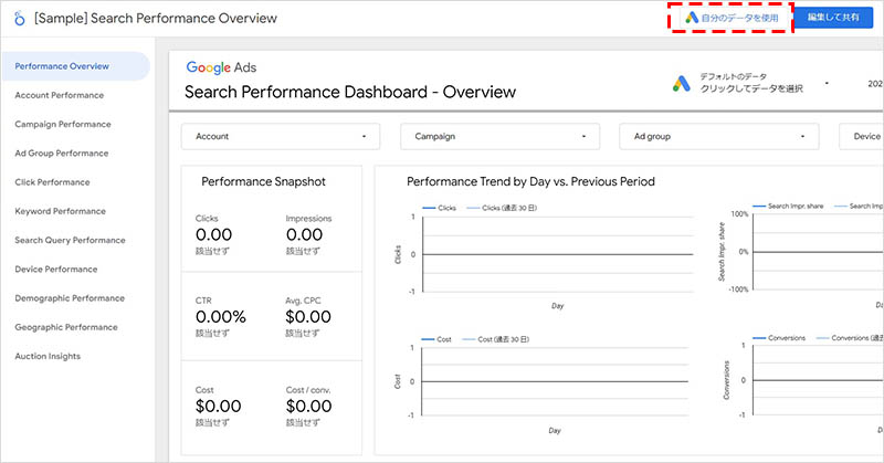 任意のテンプレートを選択します。(ここでは例として、「Google Ads Search performance」を選択して説明します)