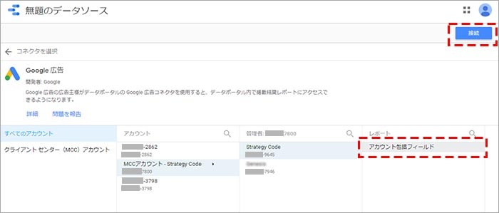 表示される広告アカウントの中から、Looker Studio(旧:データポータル)と連携する広告アカウント(広告ID)を選択していき、「レポート」の列に「アカウント包括フィールド」まで選択された状態で、「接続」をクリックします。