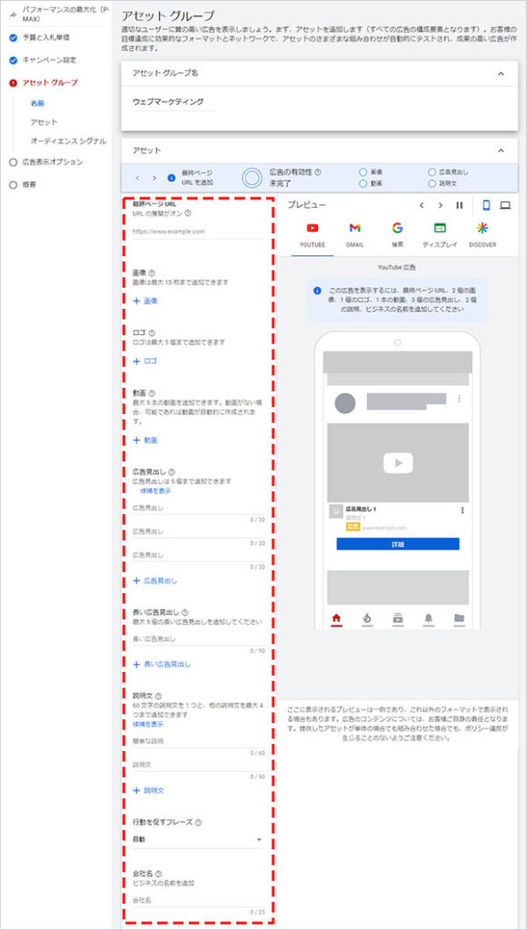 次に、アセットグループの設定に進みます。アセットでは、広告文やランディングページの指定、バナー画像の登録を行います。キャンペーン公開後にアセットを追加することが出来るため、設定時は最低1つの広告アセットを登録する必要があります。このあたりまではスマートアシストキャンペーンでの設定とほぼ同じです。