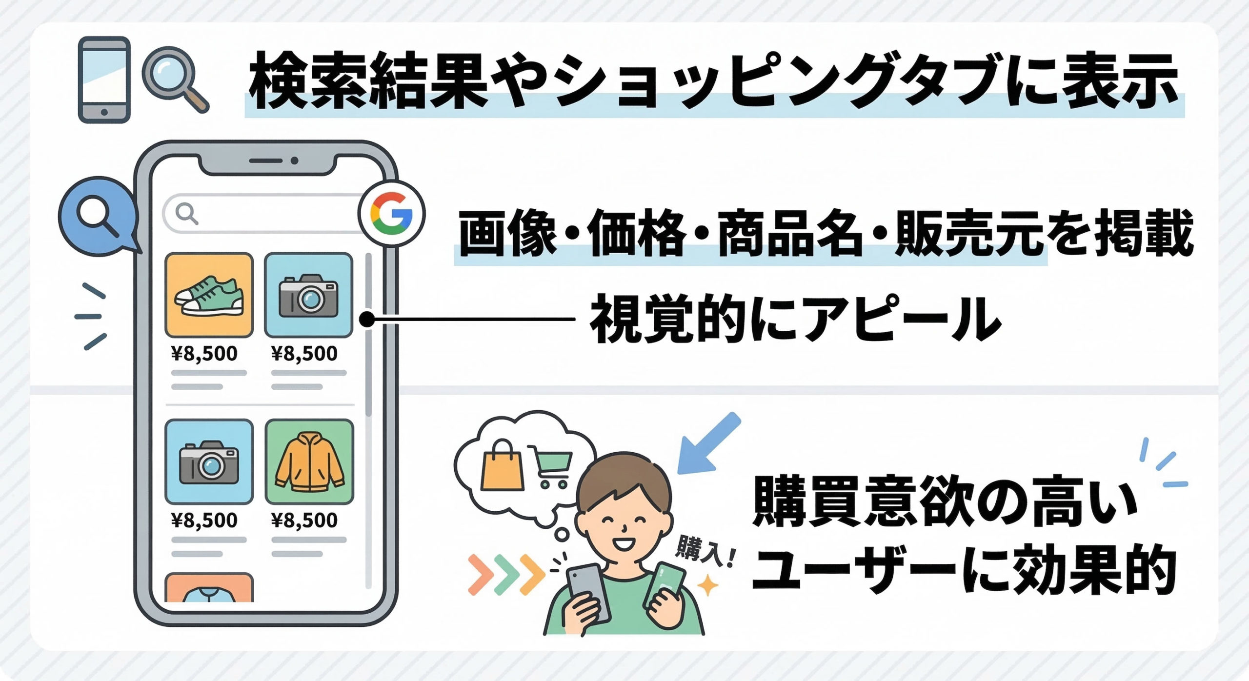 従来のテキスト広告とは異なり、視覚的な要素を活用して商品の情報を直接伝える点が特徴です。商品画像と基本情報がセットで表示されるため、ユーザーは詳細を確認する前に比較検討しやすくなります。また、検索意図が明確なユーザーがクリックする傾向が強いため、購入に繋がる可能性が高いのが大きな利点です。
