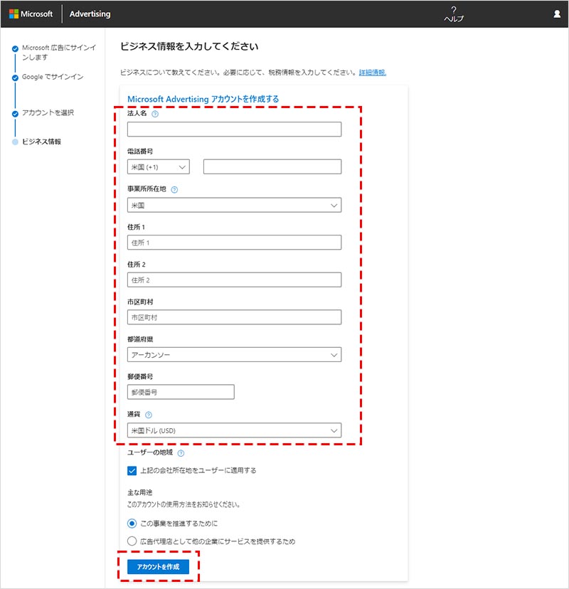 ビジネス情報を入力して、「アカウントを作成」をクリックします。