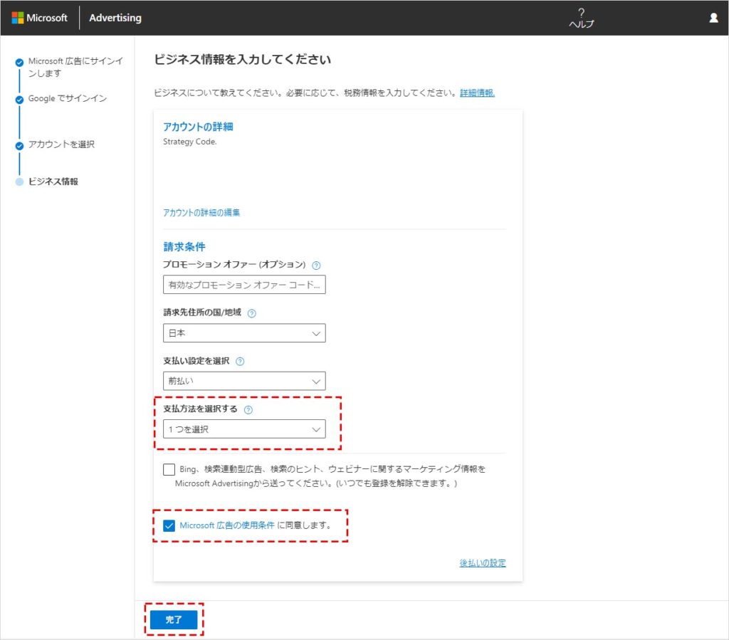 支払い情報を入力して、「Microsoft 広告の使用条件 に同意します。」のチェックボックスにチェックを入れて、「完了」をクリックします。