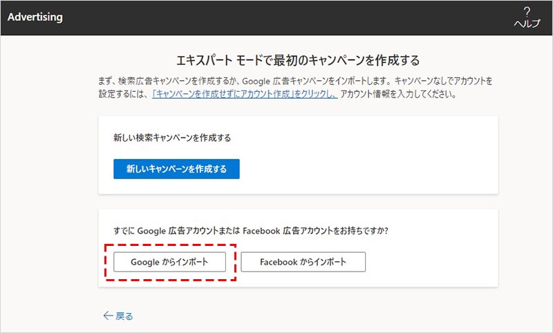 この記事では Google 広告から設定をインポートする流れを説明するため、「エキスパートモード」を使用します。「エキスパートモードに切り替える」をクリックします。