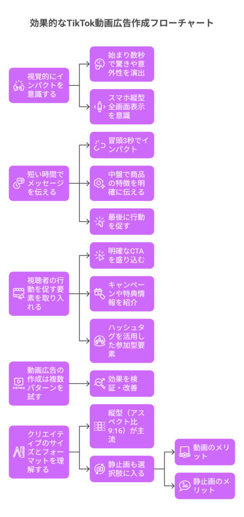 TikTok広告において、動画の質は成果に直結する最重要要素です。ユーザーは次々に動画をスワイプするため、一瞬で惹きつける工夫が欠かせません。ここでは、反応を得やすい動画広告を作成するためのポイントをご紹介します。